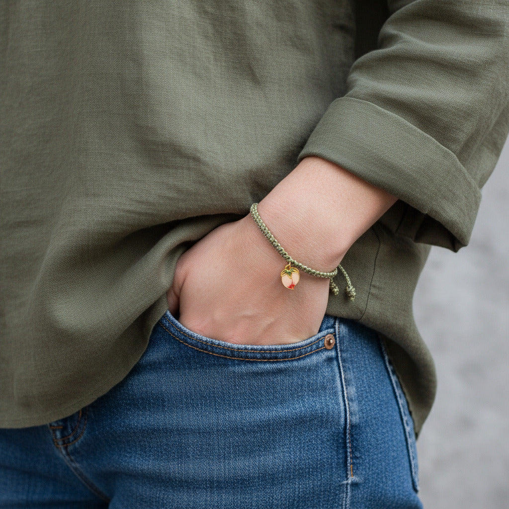 Avec son macramé subtil et sa perle plaqué or émaillé, le bracelet ANIMA offre une allure précieuse et intemporelle. Ajustable, il sublime la plupart des poignets jusqu’à 20 cm.