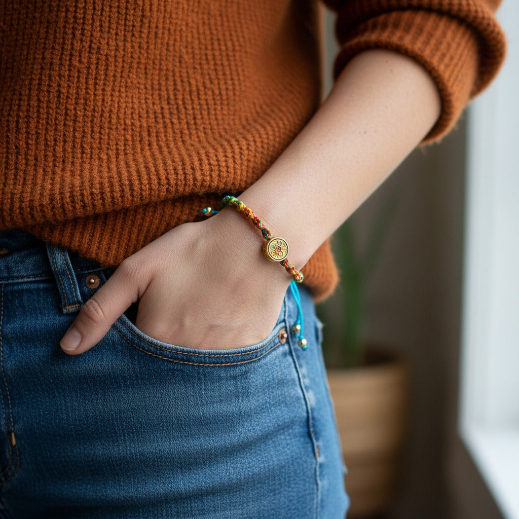 Avec son macramé subtil et sa perle plaqué or émaillé, le bracelet ANIMA offre une allure précieuse et intemporelle. Ajustable, il sublime la plupart des poignets jusqu’à 20 cm.