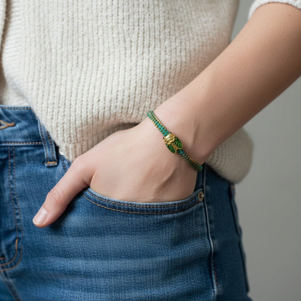 Avec son macramé subtil et sa perle plaqué or émaillé, le bracelet ANIMA offre une allure précieuse et intemporelle. Ajustable, il sublime la plupart des poignets jusqu’à 20 cm.
