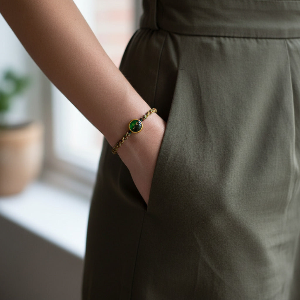 Avec son macramé subtil et sa perle plaqué or émaillé, le bracelet ANIMA offre une allure précieuse et intemporelle. Ajustable, il sublime la plupart des poignets jusqu’à 20 cm.