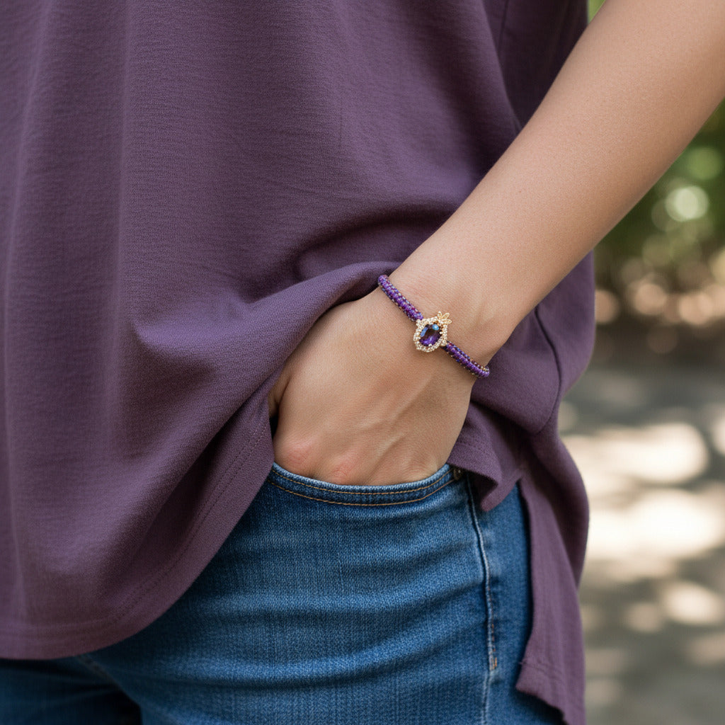 Avec son tressage de macramé raffiné et sa perle centrale en métal plaqué or, pavée d’oxydes de zirconium et sertissant un zirconium violet éclatant, ce bracelet ANIMA révèle une allure délicate et sophistiquée.