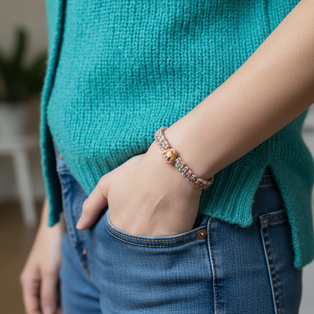 Avec son macramé subtil et sa perle plaqué or émaillé, le bracelet ANIMA offre une allure précieuse et intemporelle. Ajustable, il sublime la plupart des poignets jusqu’à 20 cm.