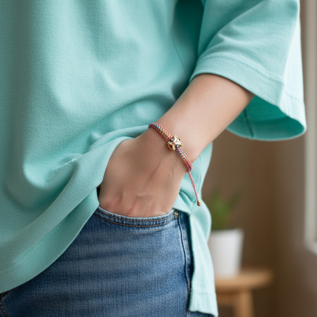 Avec son macramé subtil et sa perle en métal plaqué or émaillé, le bracelet ANIMA offre une allure précieuse et intemporelle. Ajustable, il sublime la plupart des poignets jusqu’à 20 cm.