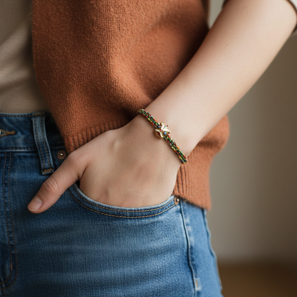 Avec son macramé subtil et sa perle plaqué or émaillé, le bracelet ANIMA offre une allure précieuse et intemporelle. Ajustable, il sublime la plupart des poignets jusqu’à 20 cm.
