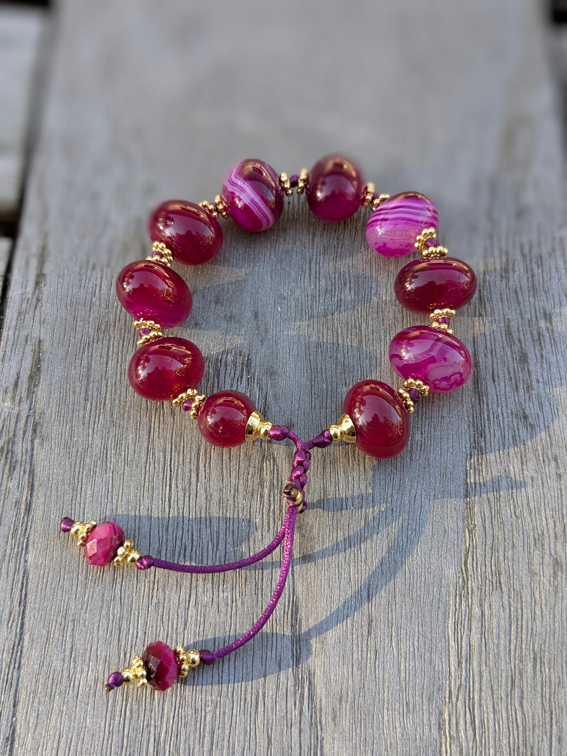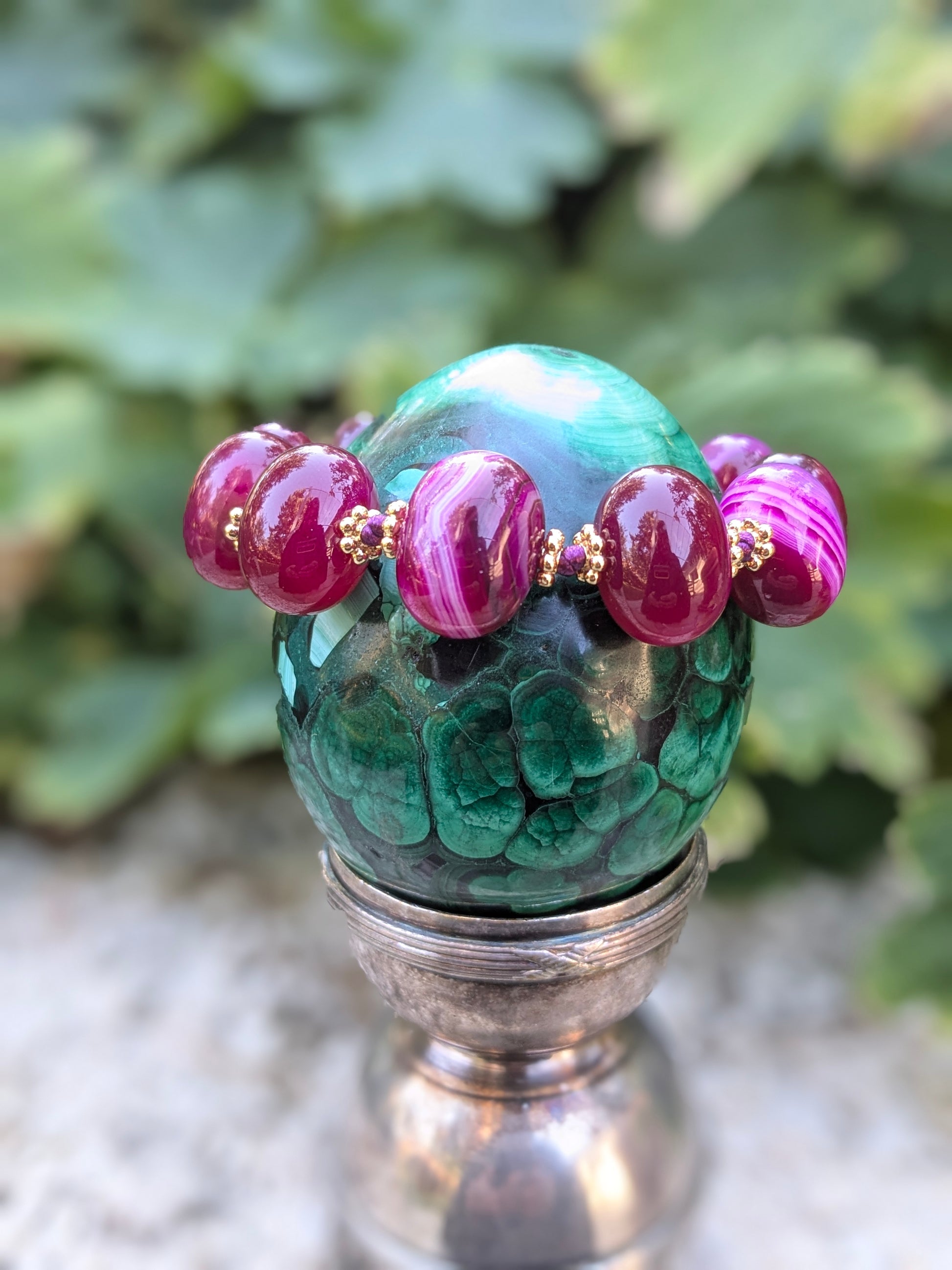 Bracelet en agates tie & dye rose fuchsia, au volume généreux et aux nuances vibrantes. Une pièce audacieuse qui capte la lumière et donne du caractère à votre poignet.