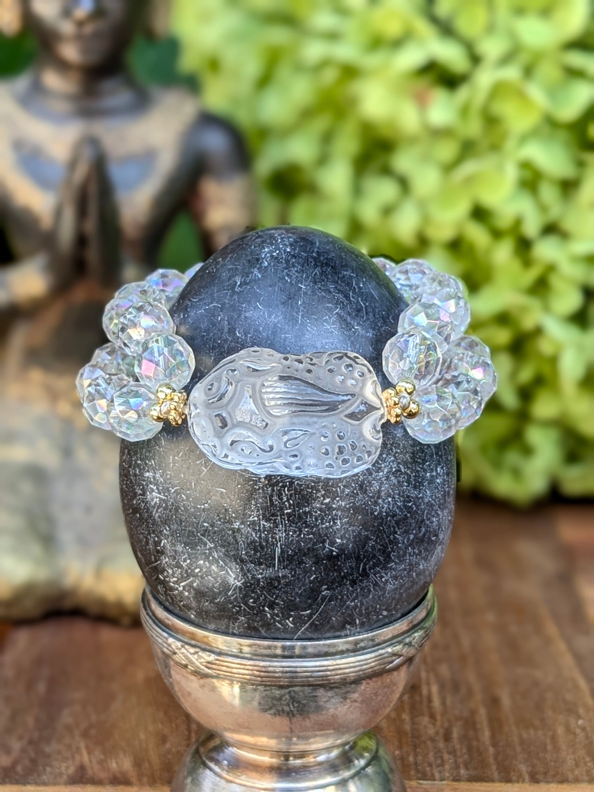 Découvrez le Bracelet Pixiu Céleste Irisé, un bijou délicatement chatoyant qui allie élégance et protection. Composé d’un double rang de cristal de roche galvanisé aux reflets subtils, il évoque la légèreté et la magie des bulles de savon.