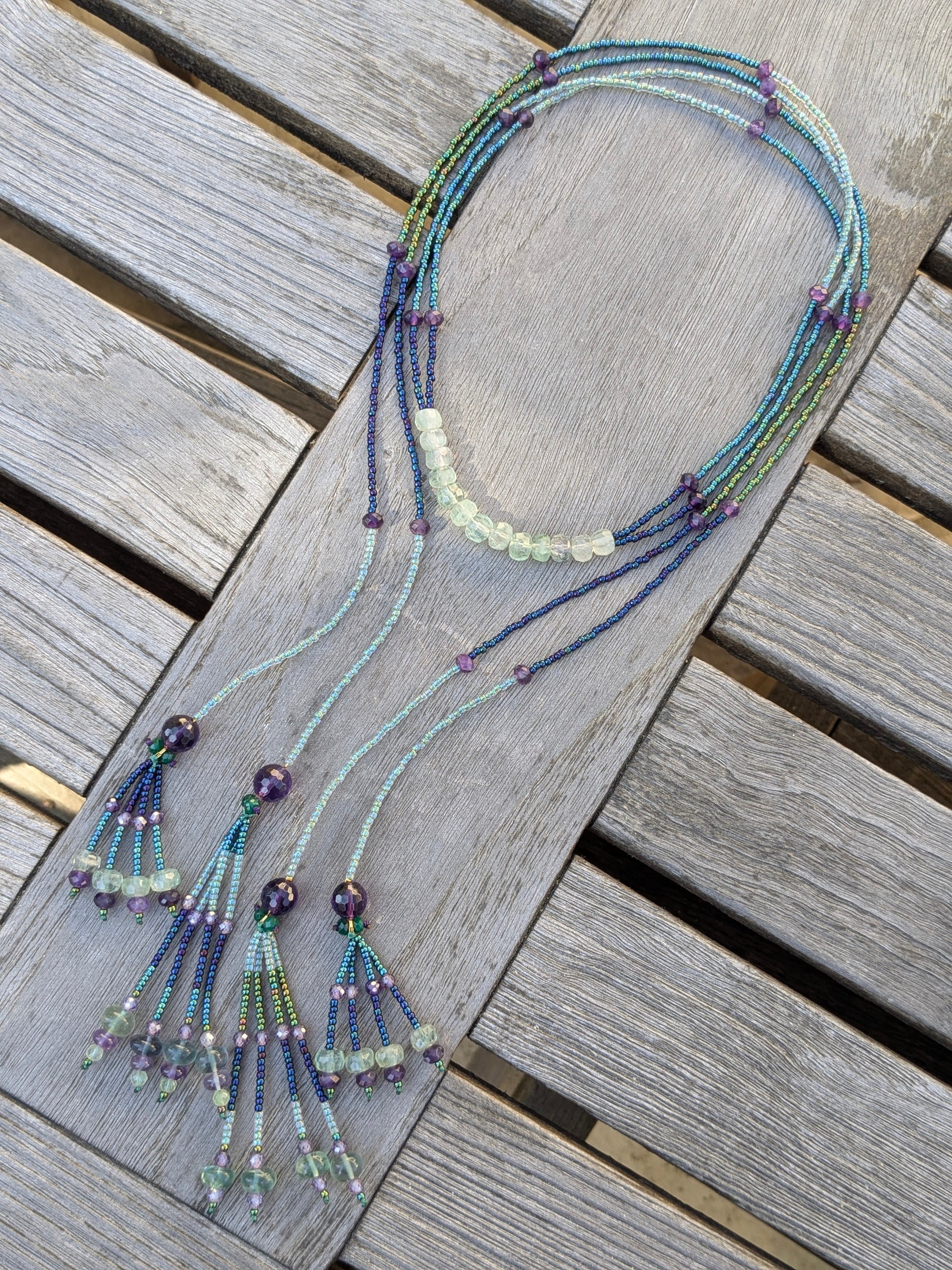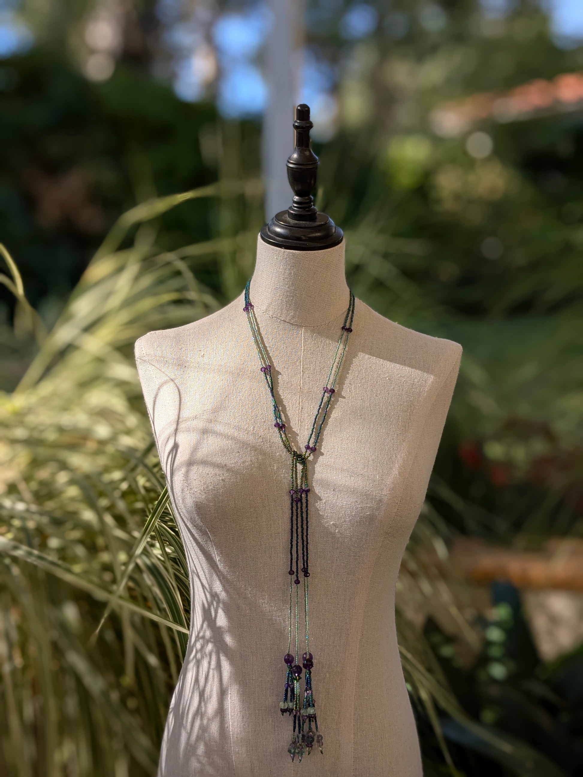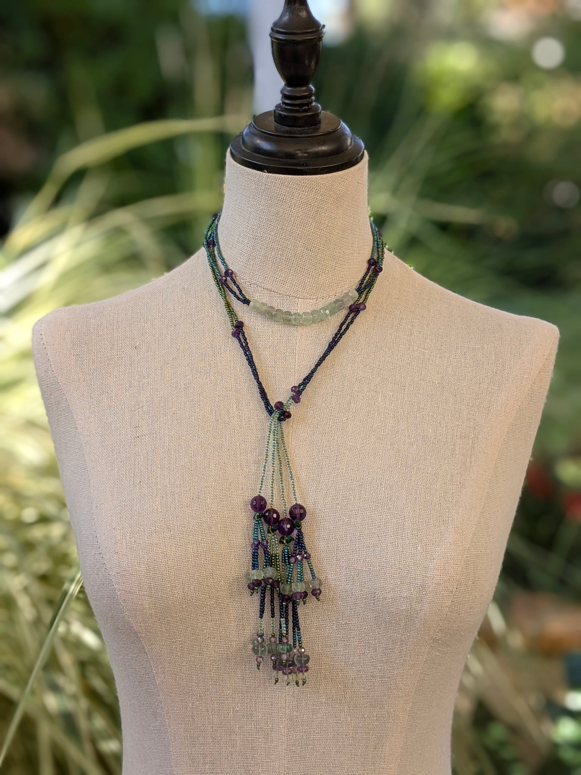 Ce collier associe la finesse irisée des rocailles Miyuki à la douceur vibrante de la fluorite verte et aux touches profondes d’améthystes, créant un dégradé subtil et élégant.
