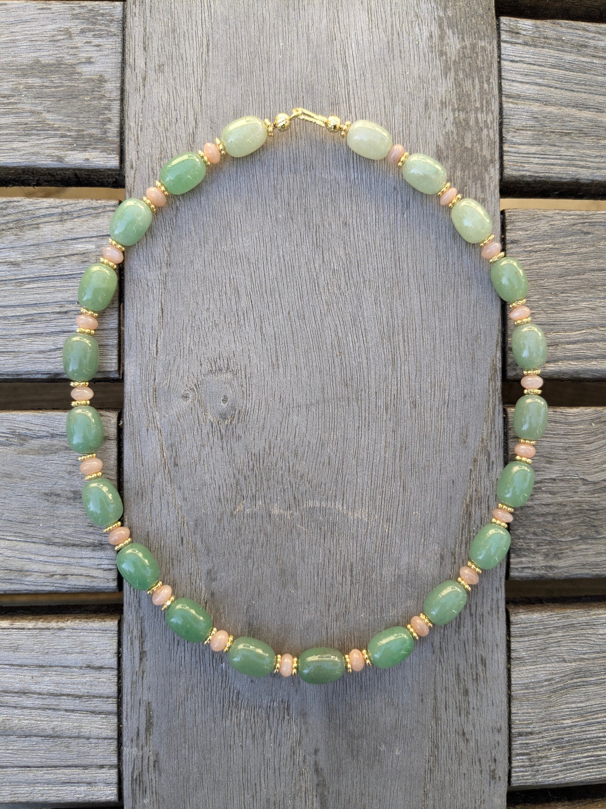 Ce collier associe l’aventurine verte lisse, symbole d’apaisement et d’équilibre, à la pierre de lune pêche lisse, éclat tendre et lumineux.