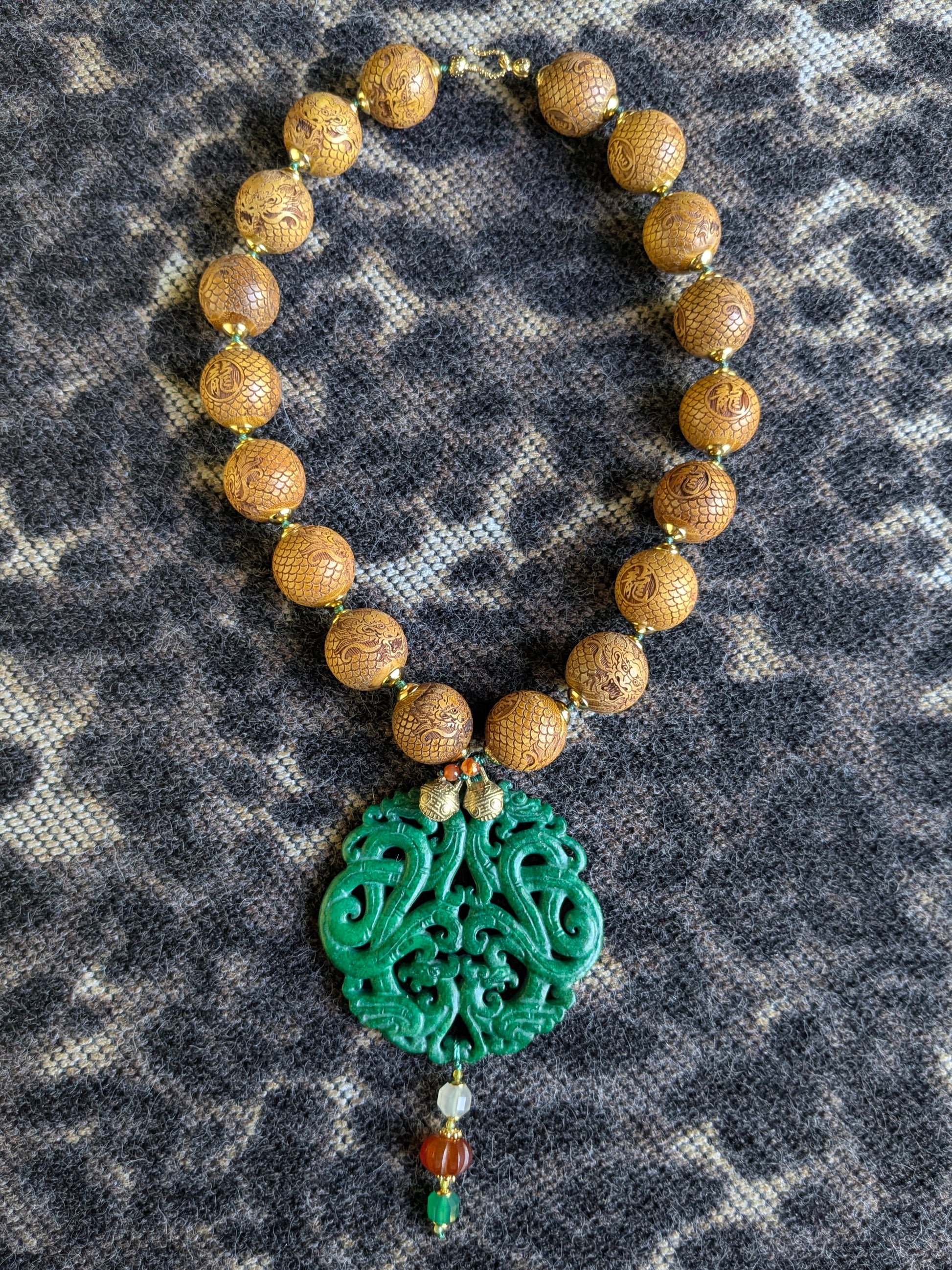 Alliant chaleur et puissance, ce collier est composé de perles en bois miel finement ciselées, ornées de dragons et d’un motif écaille qui évoquent force, protection et sagesse.