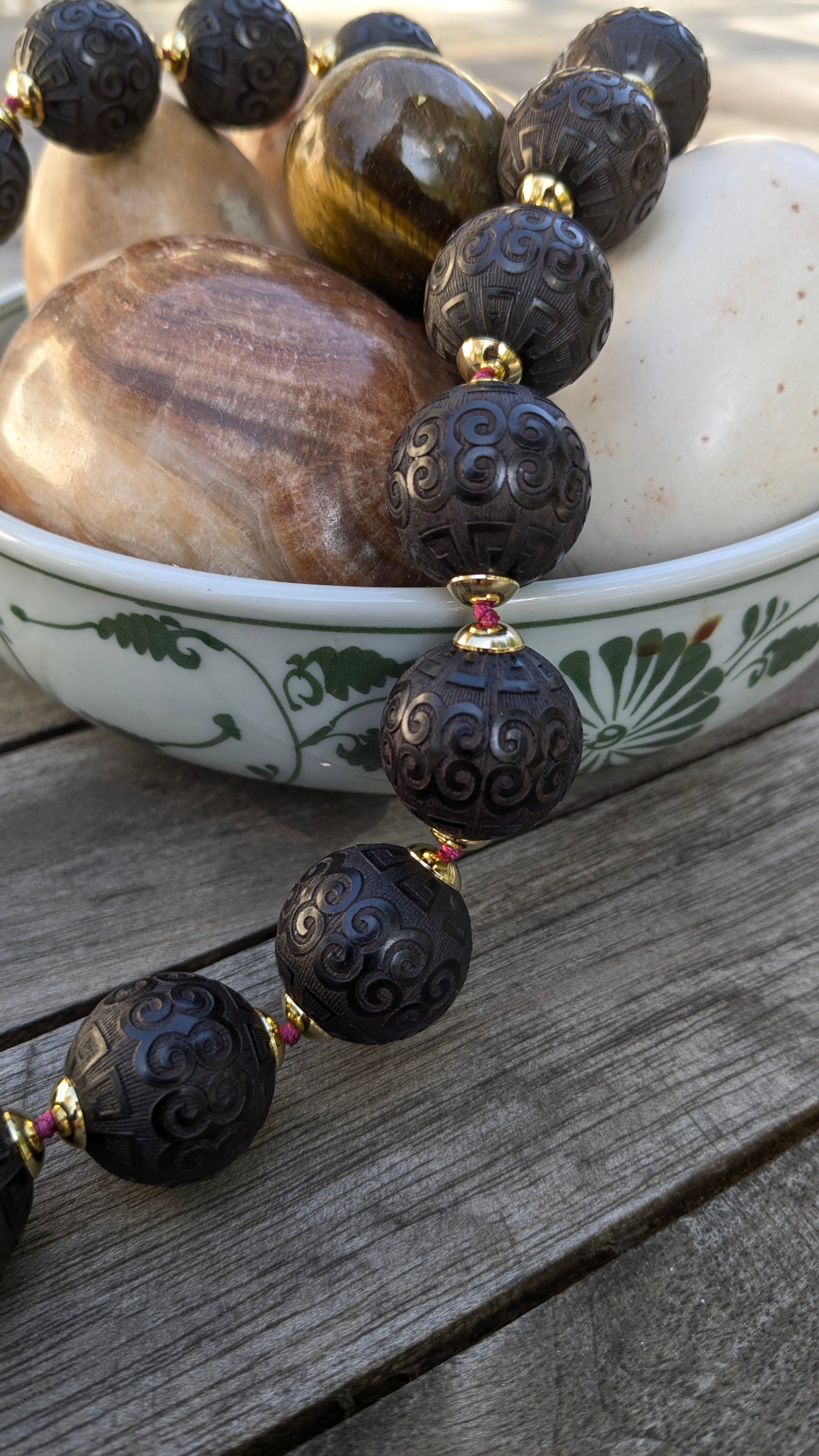 Les perles ciselées en santal noir diffusent une aura apaisante, tandis que les clochettes népalaises en laiton, décorées d’une tête de tigre, invoquent le courage, la vigilance et la protection spirituelle.