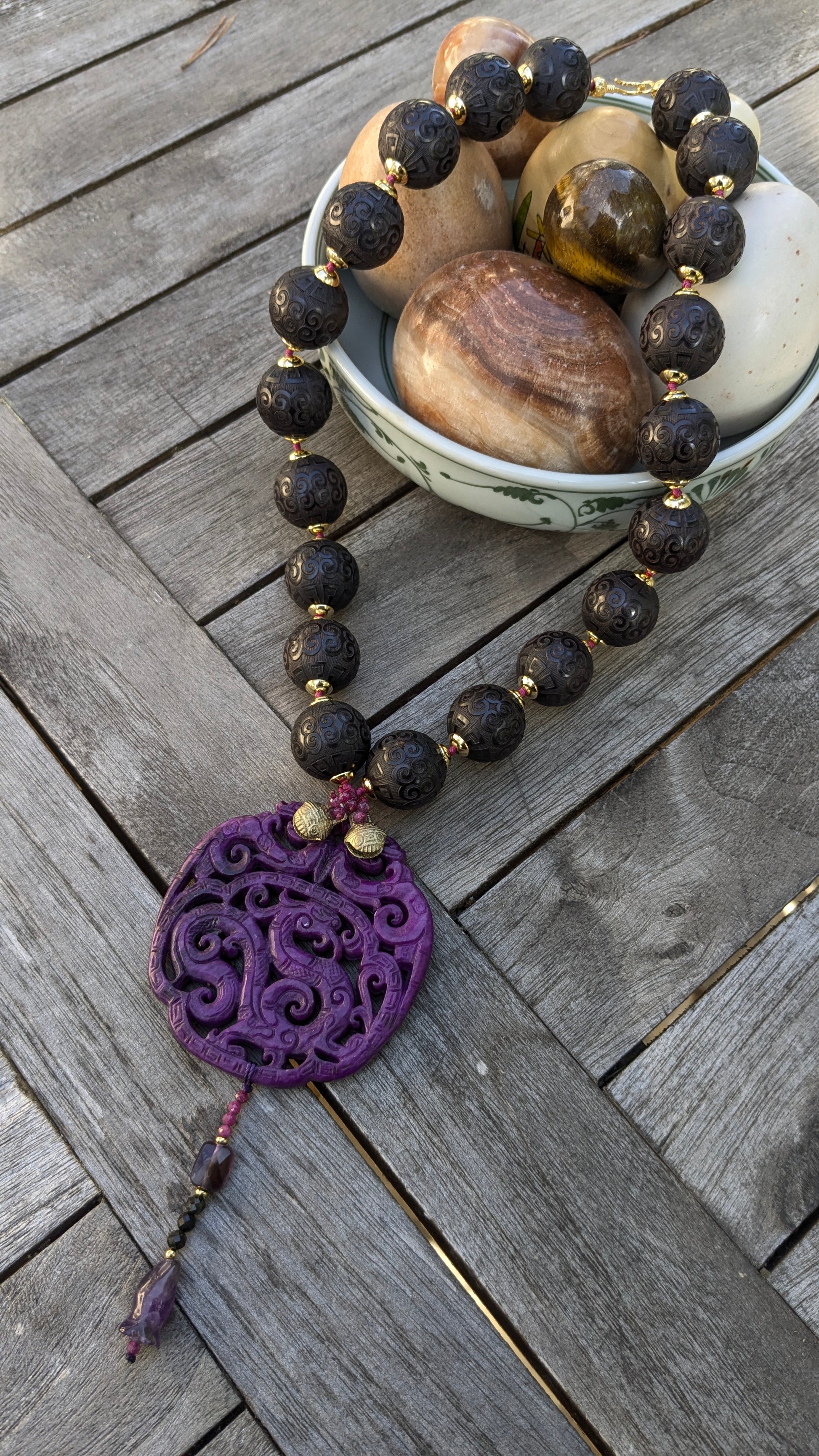Ce médaillon en jade néphrite violet, d’un ton profond et opaque, incarne la puissance tranquille et la noblesse spirituelle. Il est orné de trois dragons, symboles impériaux de protection, de prospérité et de force vitale. Dans la tradition chinoise, le dragon représente le souffle créateur (Qi), la chance et la sagesse souveraine, gardien des énergies bienveillantes.