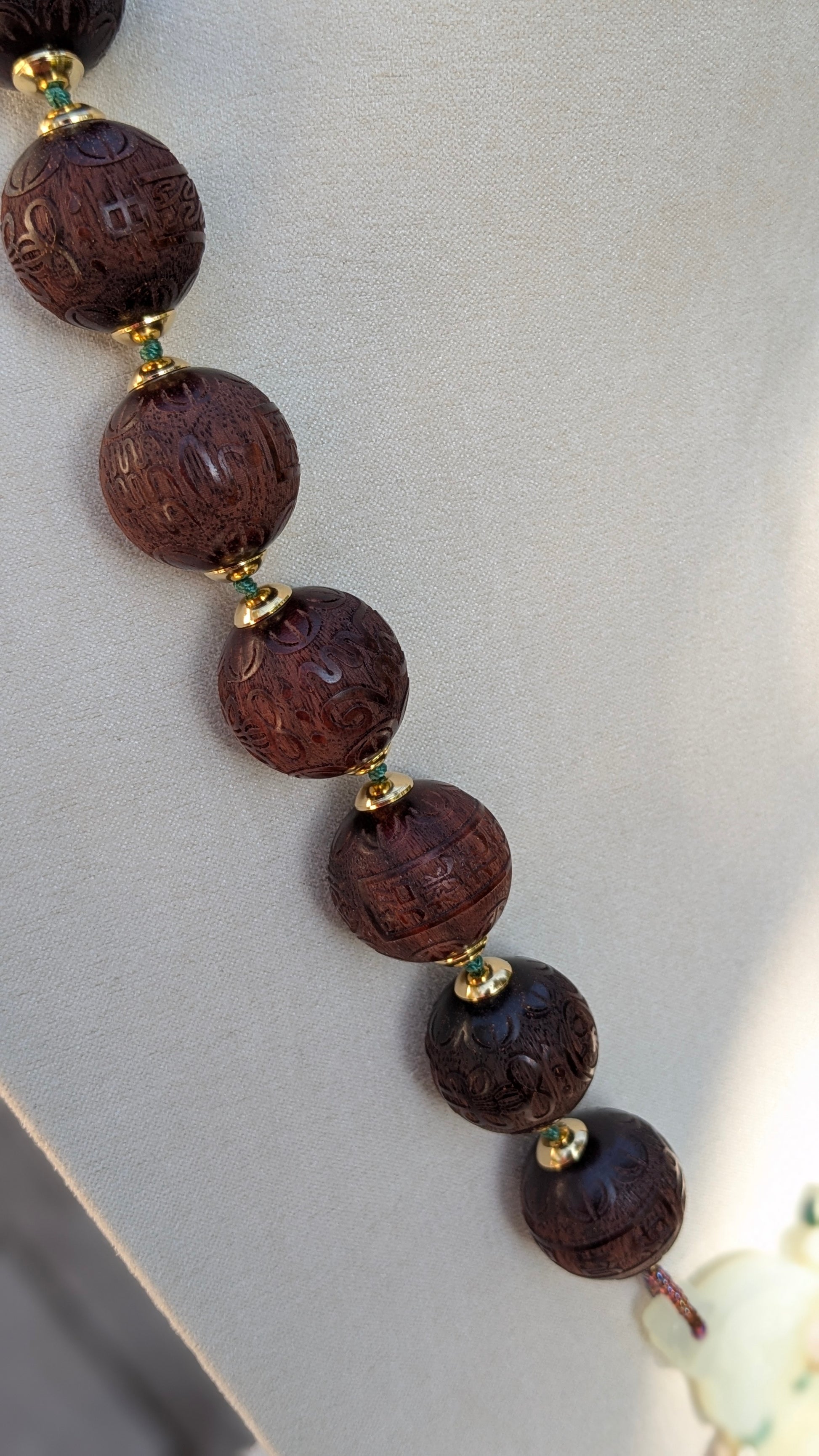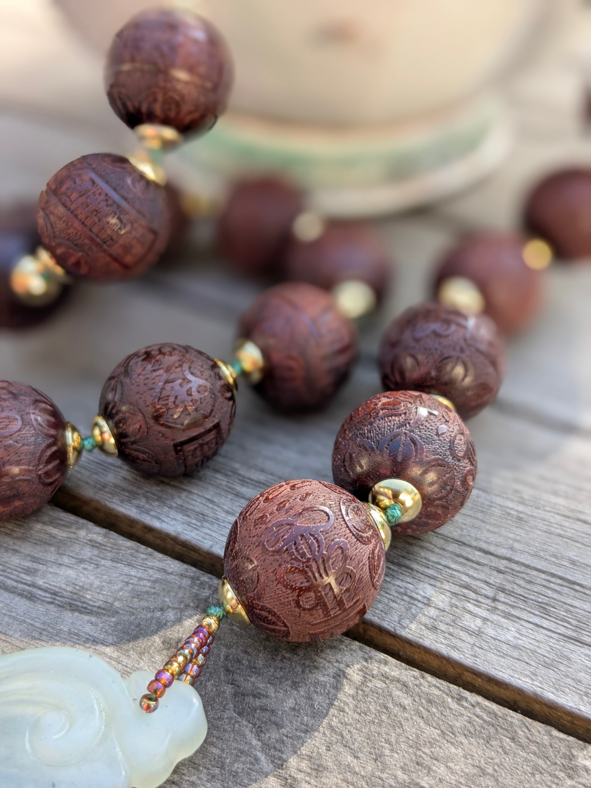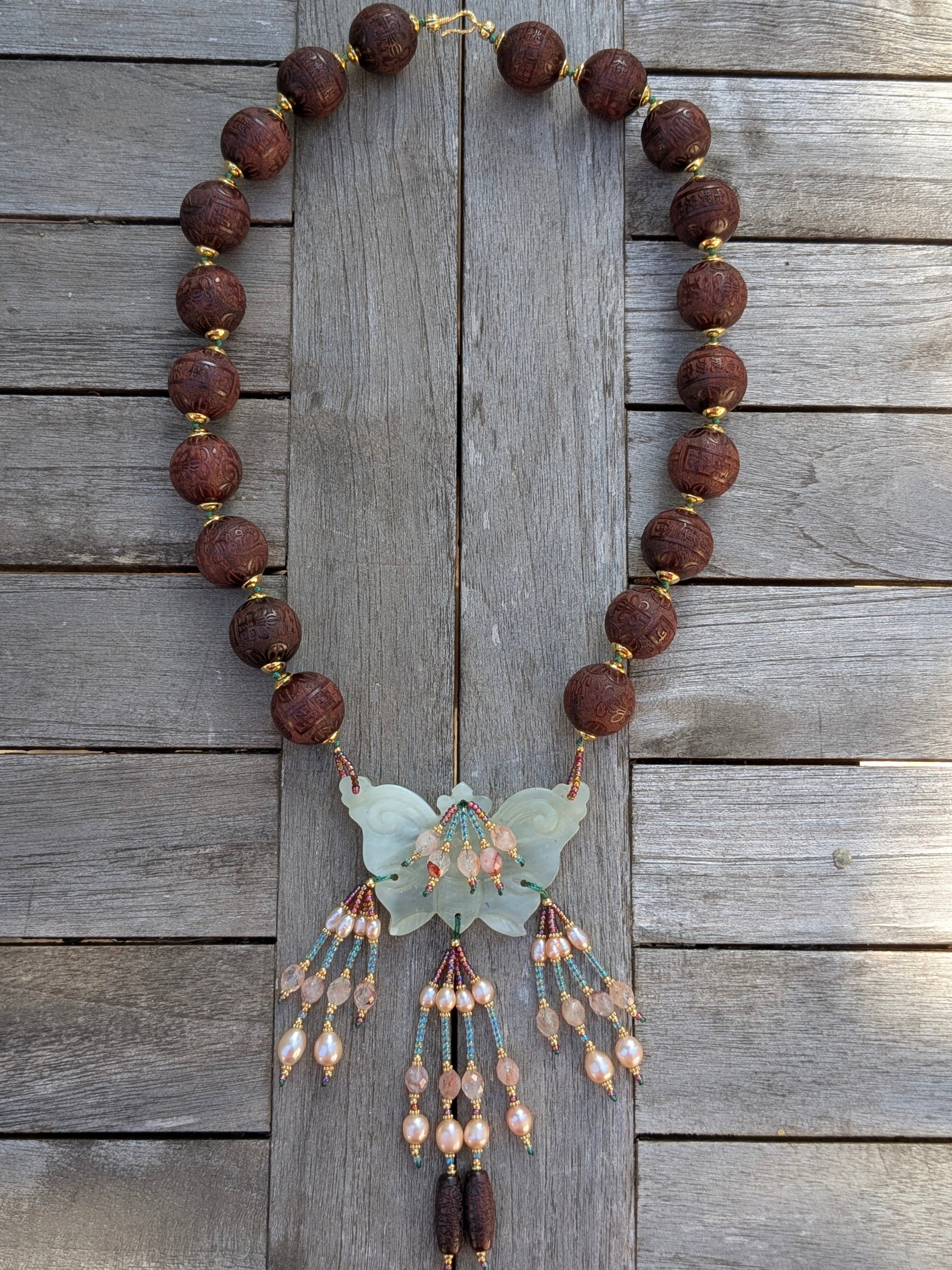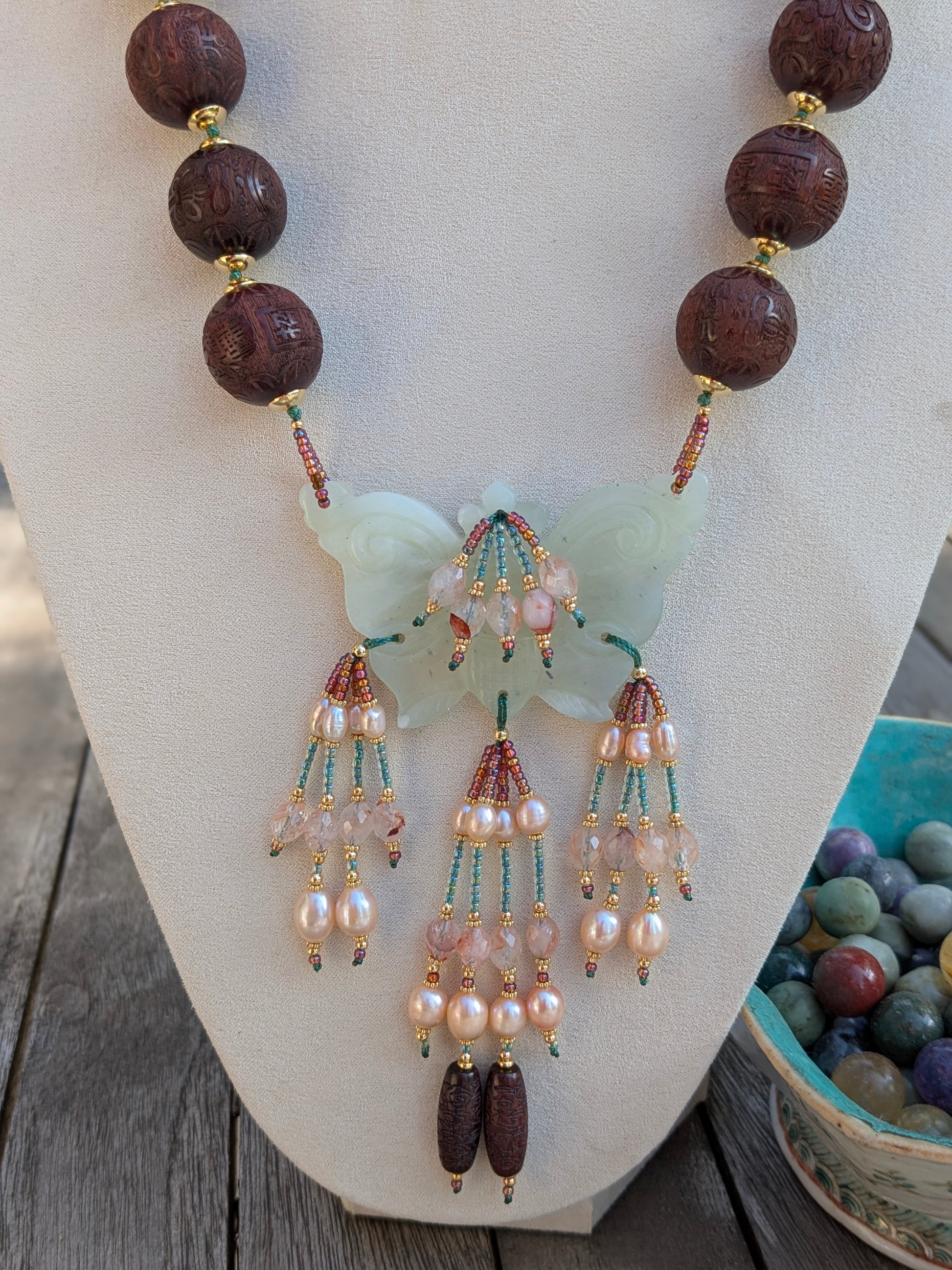 Sous un éclat vert pâle et translucide, le médaillon papillon en jade néphrite naturel semble prêt à s’envoler, symbole de renouveau et de légèreté. Chaque perle de bois de santal rouge délicatement ciselée crée un écrin chaleureux et raffiné, soulignant la sophistication de ce bijou unique.