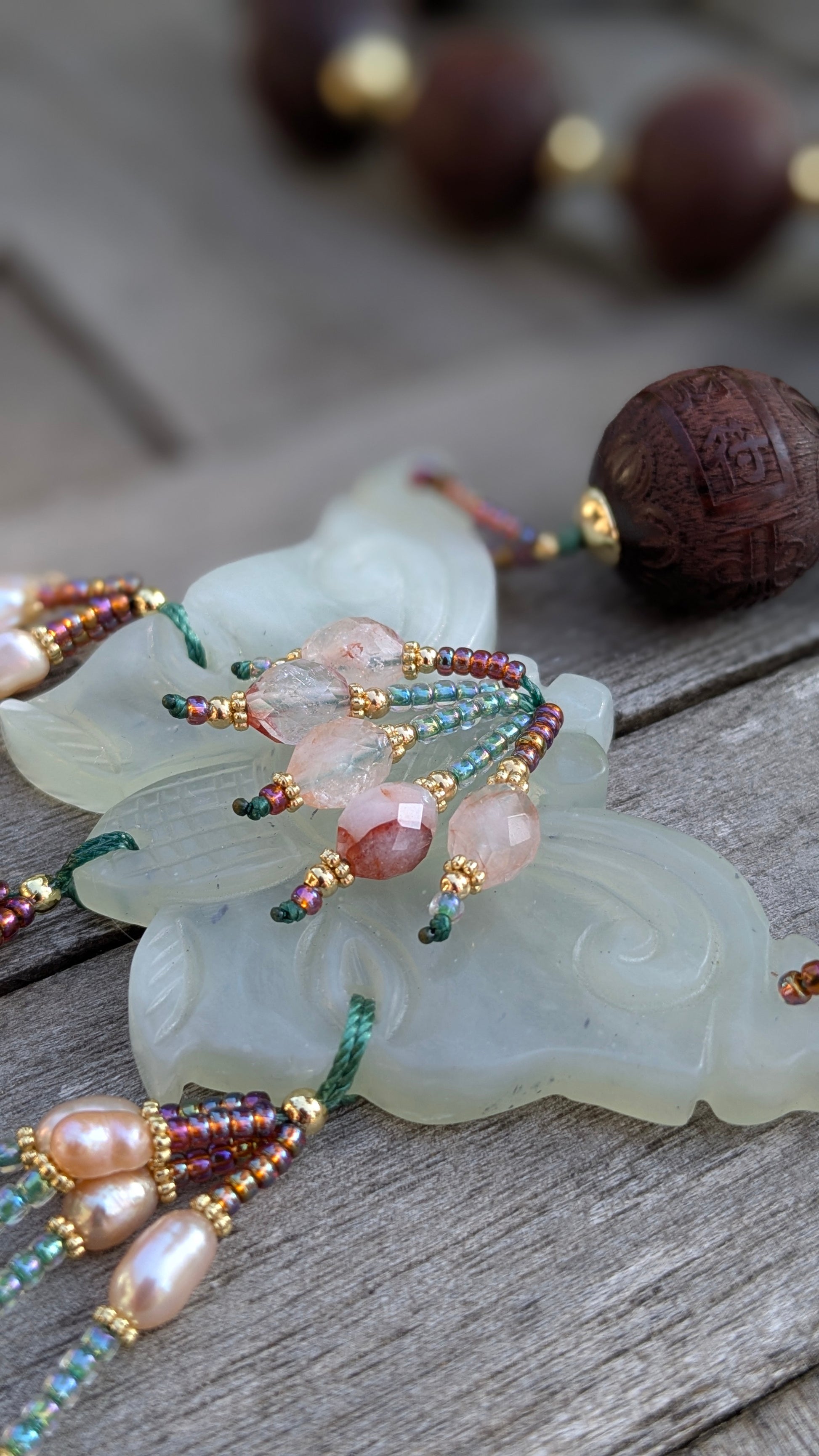 Des pampilles dansantes, parées de rocailles Miyuki irisées, de perles d’eau douce pêche, de quartz hématoïde et de bois de santal, captent la lumière à chaque mouvement, insufflant au collier une aura féérique et vibrante. Entre elles, les perles sculptées de pivoines et de phénix racontent l’histoire de la beauté, de la prospérité et de la renaissance, tandis que le tassel en améthyste et quartz à rutile doré apporte éclat et harmonie.
