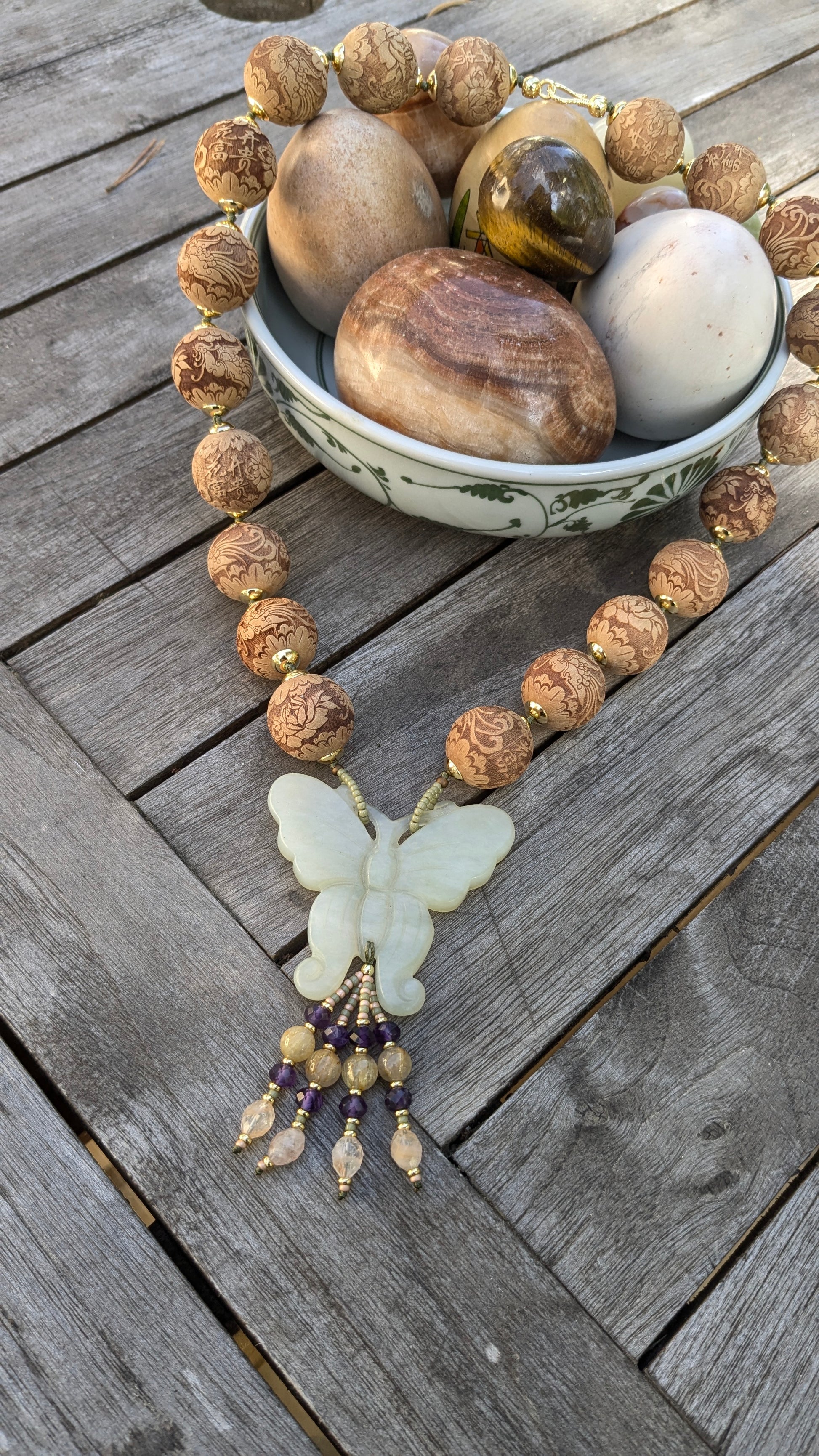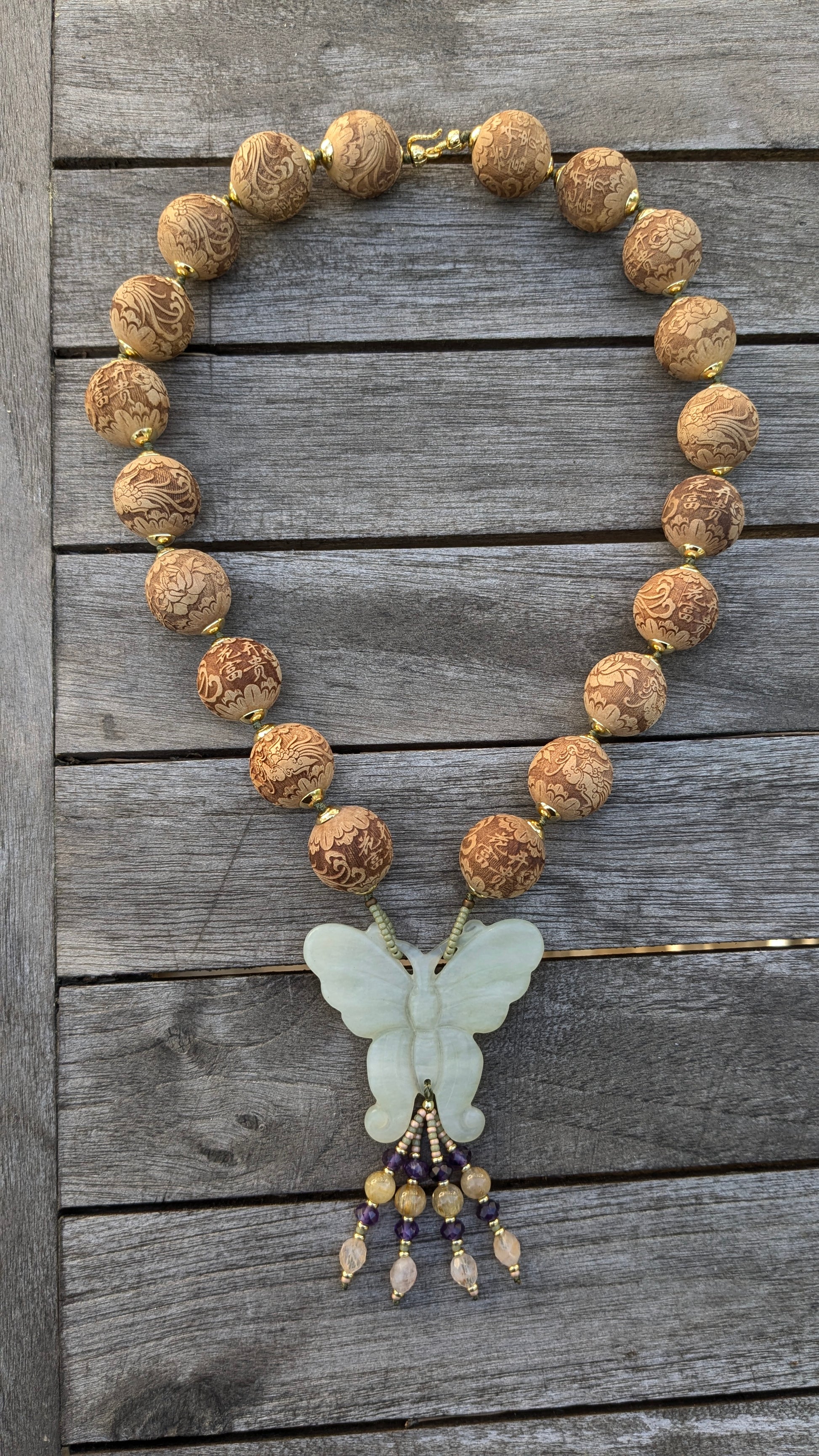 Ce collier délicat met en valeur un médaillon papillon en jade néphrite naturel vert pâle et translucide, symbole de transformation, de renouveau et de légèreté. Les perles de bois finement ciselées sont décorées de pivoines et de phénix, symboles respectivement de beauté, de prospérité et de renaissance.