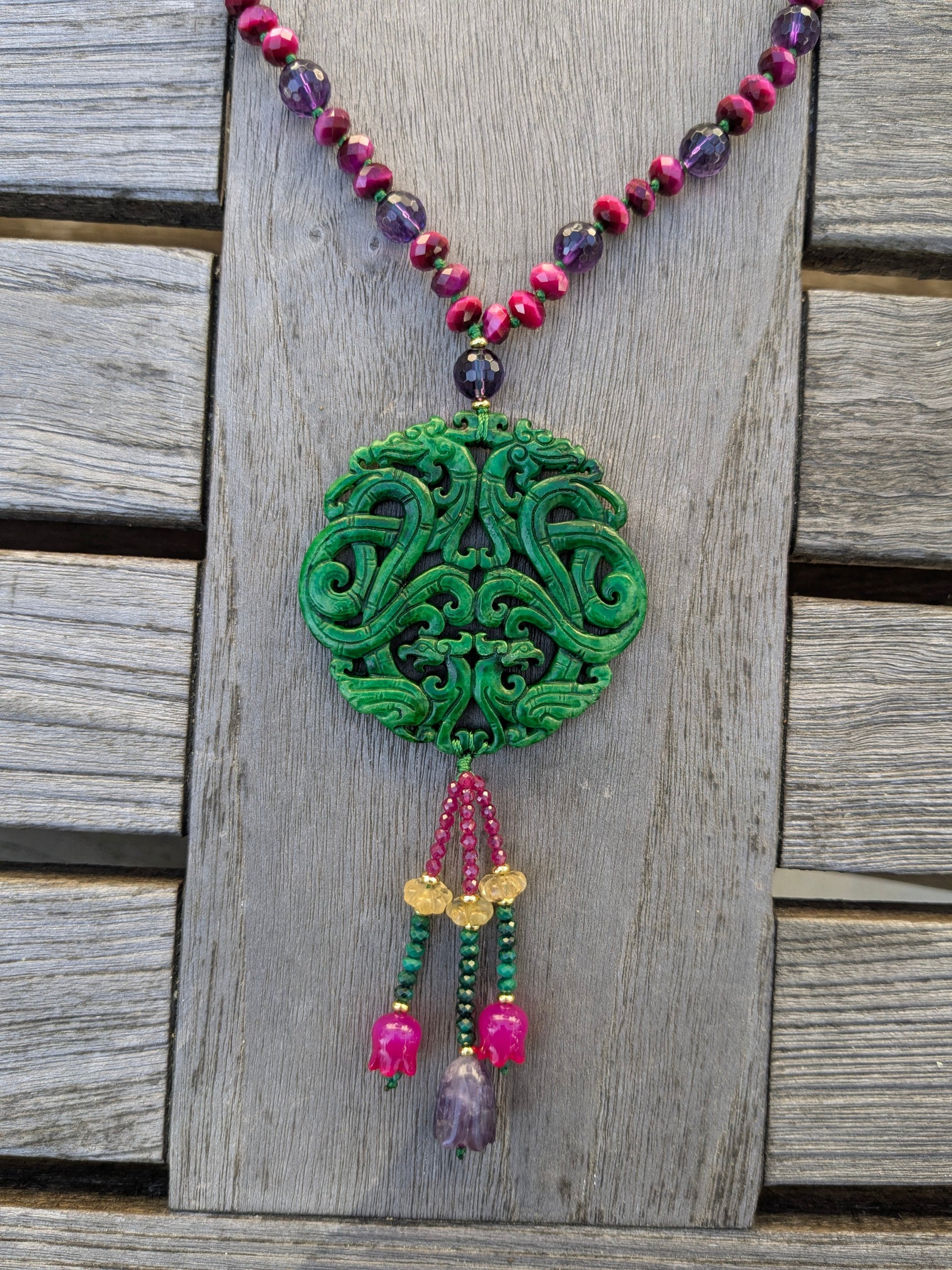 Le collier est agrémenté de pierres fines telles que l’œil de tigre fuchsia et l’améthyste, qui apportent protection et apaisement.