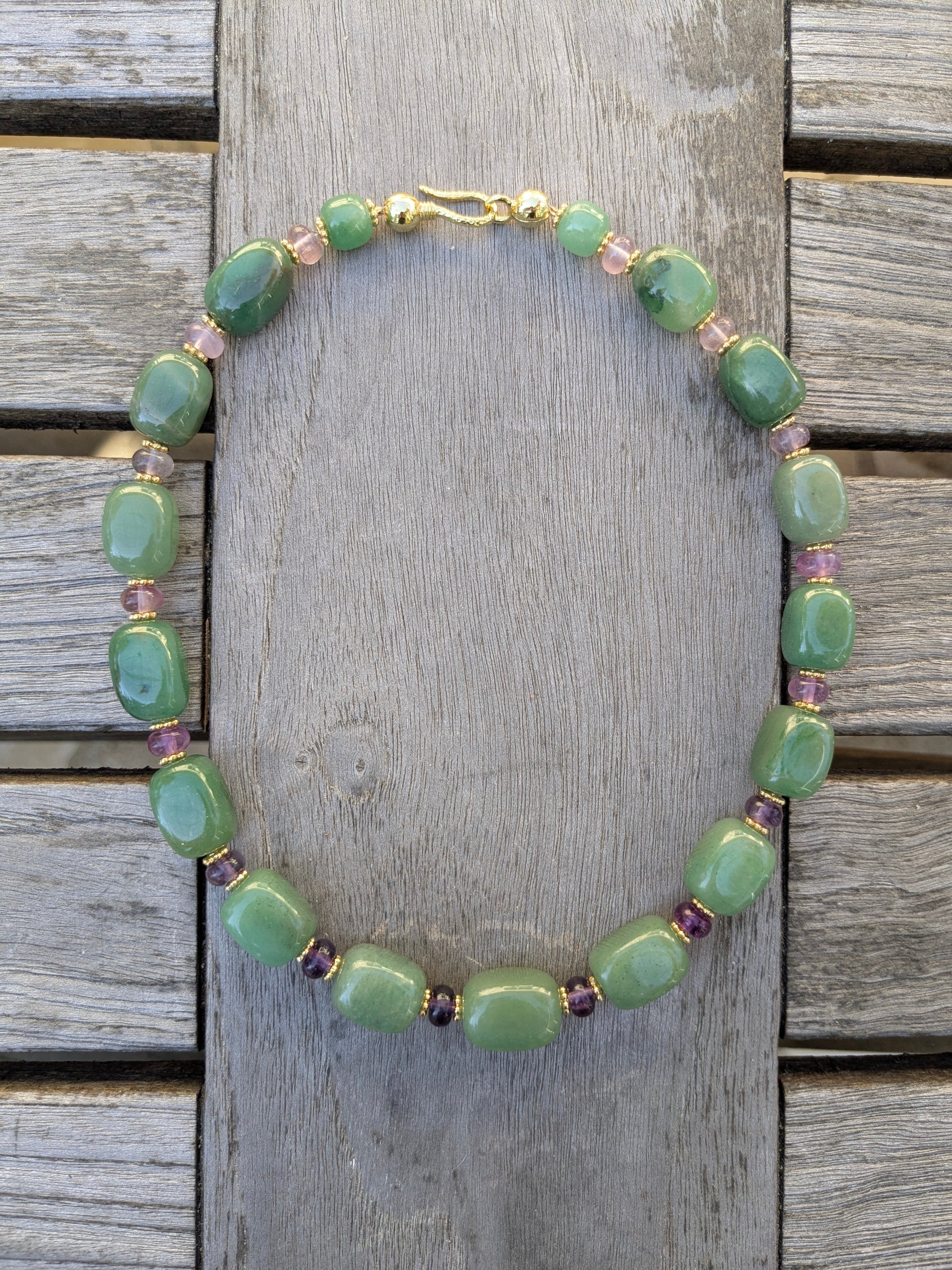 Ce collier volumineux réunit l’aventurine verte, pierre d’ancrage et de renouveau, à la fluorite violette dégradée, lumineuse et hypnotique. Son volume généreux et ses nuances vibrantes offrent une présence élégante et inspirante.